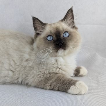 Colorpoint Ragdolls, also known as point Ragdolls, have full colored legs & faces with no white markings. The points also appear darker, with well-defined color on the ears, mask, feet, & tail. The nose & paw pads match the point’s color.
