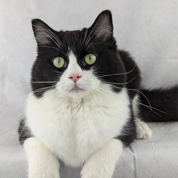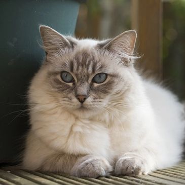 Mitted Ragdolls have, as the name suggests, white mitts on their paws. The mitts on the front paws are evenly matched & stop where the paw bends. The mitts on the hind legs extend up to the middle of the leg. They also have white chins that extend into a white stripe on the belly. Their noses match the color of their coats.