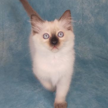 Traditional Ragdolls are the most popular, commonly found Ragdoll type. They are born completely white & start slowly acquiring their color between 4 to 14 days old. Their color continues to come in until up to 3 years. They are the lightest of the four types. Traditional Ragdolls are well known for their bright, beautiful blue eyes.